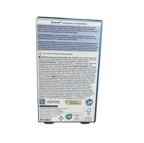 Farb-Und Schutzfangtucher Denk Mit – це абсорбуючі серветки, які запобігають випадковому забарвленню тканин і поглинають розчинені частинки барвника та бруду, не даючи їм осідати на інших виробах. Вони захищають білизну від вицвітання, вбирають фарбу та бруд. У процесі прання білизни вимивають бруд та барвники.