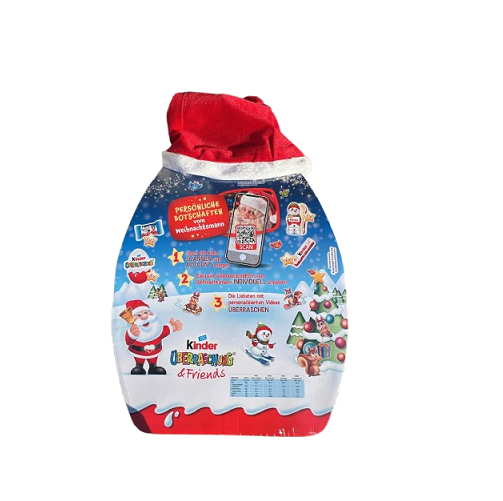 Шапочка Санти в комплекті. Унікальна форма упаковки у вигляді яйця для прихильників смаколиків від всесвітньо відомого виробника Кіндер.  За віконечками ви знайдете: